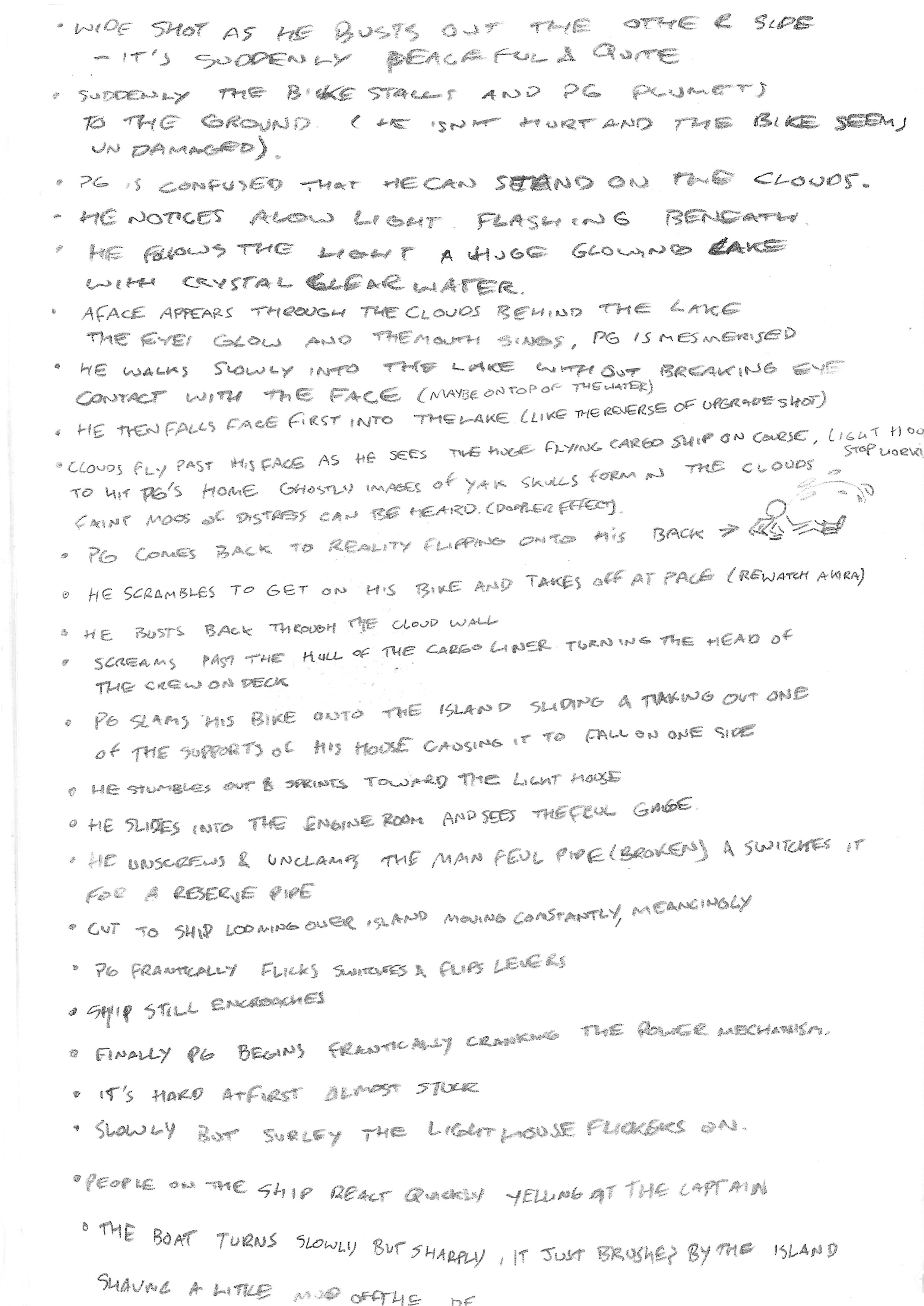 After warming up with a bit of drawing I started on laying out the beats. This is something I learned on a story boarding work experience placement ages ago. You start out the story by simply writing out a list of things that are going to happen. Don’t worry about missing stuff or getting into to much detail just get something out and get started.