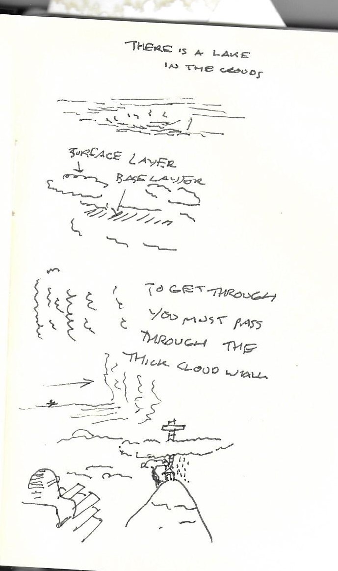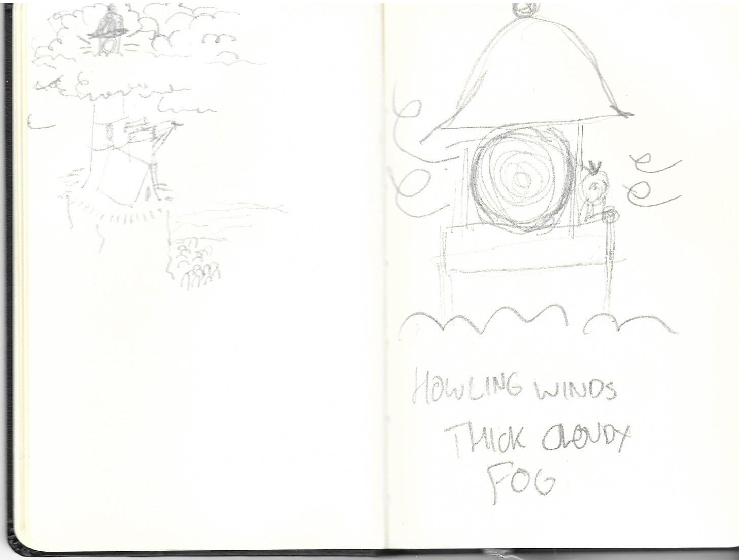 I came up with the seedling for this film returning to the UK from Finland in the new year of 2020. Coming into Southampton airport on a dismal grey morning I was lucky to have a window seat. I got to do my favourite part of flying looking at the tops of the clouds. Whilst looking out I saw a basin formation in the clouds and I had an idea about how nice it would be to be able to go and be amongst the clouds so I started sketching.
