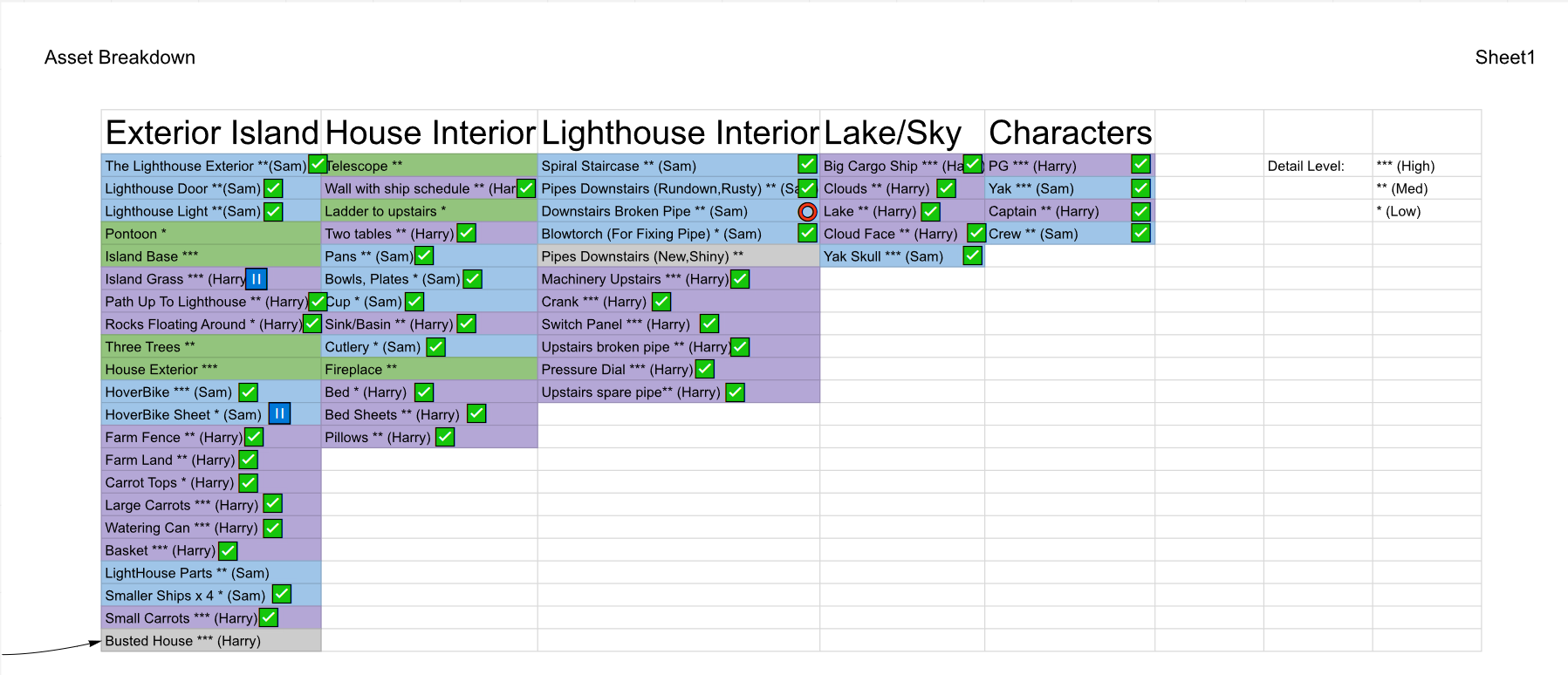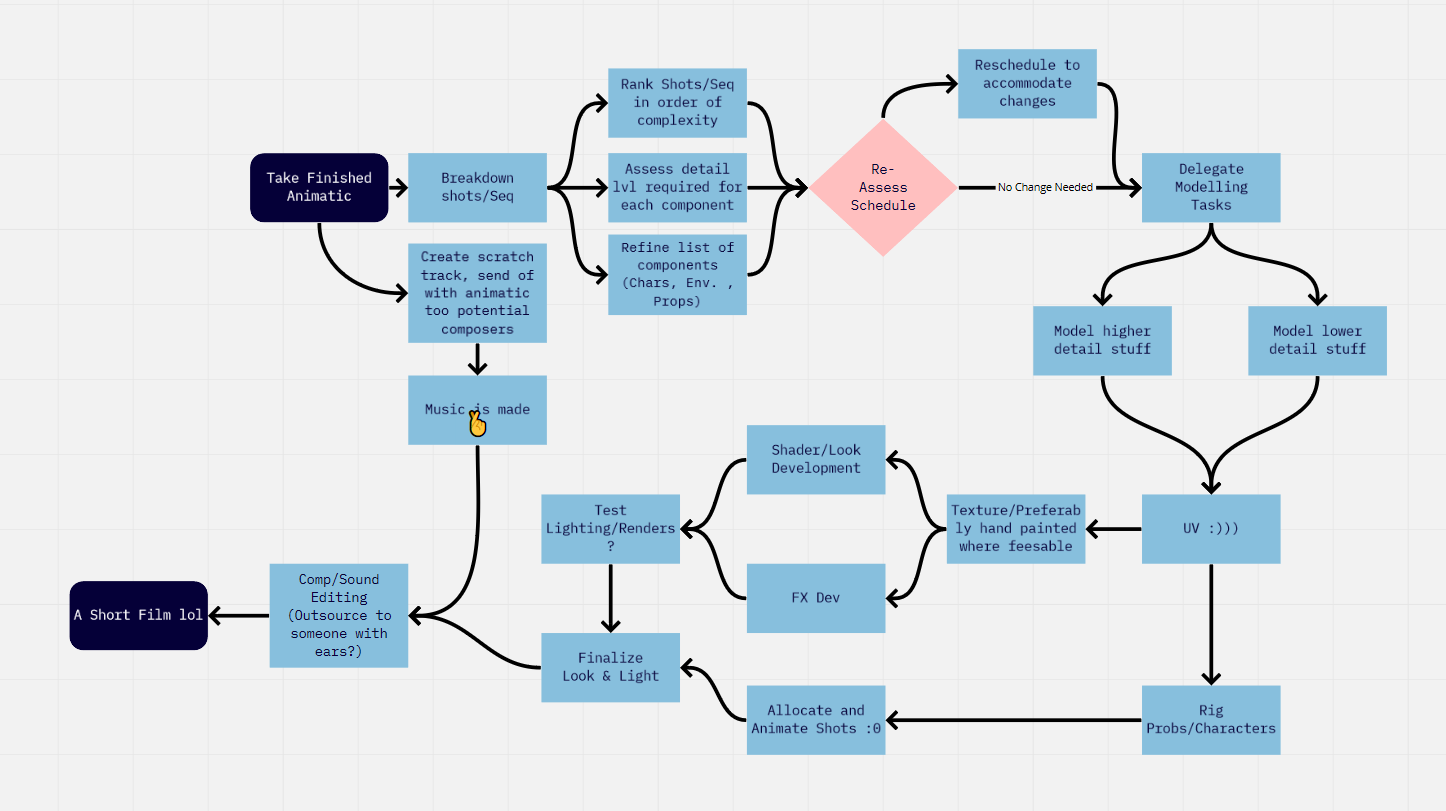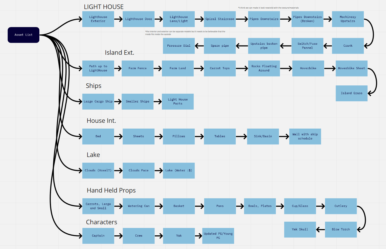 In order to get organised I made flowcharts to help dictate how we would go through each stage and also which props we should model first and then a checklist to so we knew who was doing what.