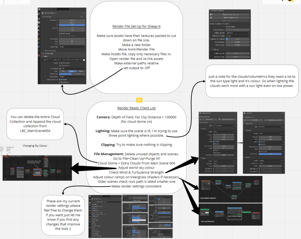 This was a rewarding but fairly tedious task with a lot of rendering and re-rendering. First of all the file had to moved to a new folder that could be zipped up and sent of to a cloud rendering service. The textures then had to be linked up properly and then we’re ready to put in lights. In the final render we will only see what is illuminated in the scene so lighting has a big effect on what the audience will see. After the scene is lit there is a whole host of things to check off the list before I render. Here is my render checklist which I used to try keep consistency between sequences and shots.